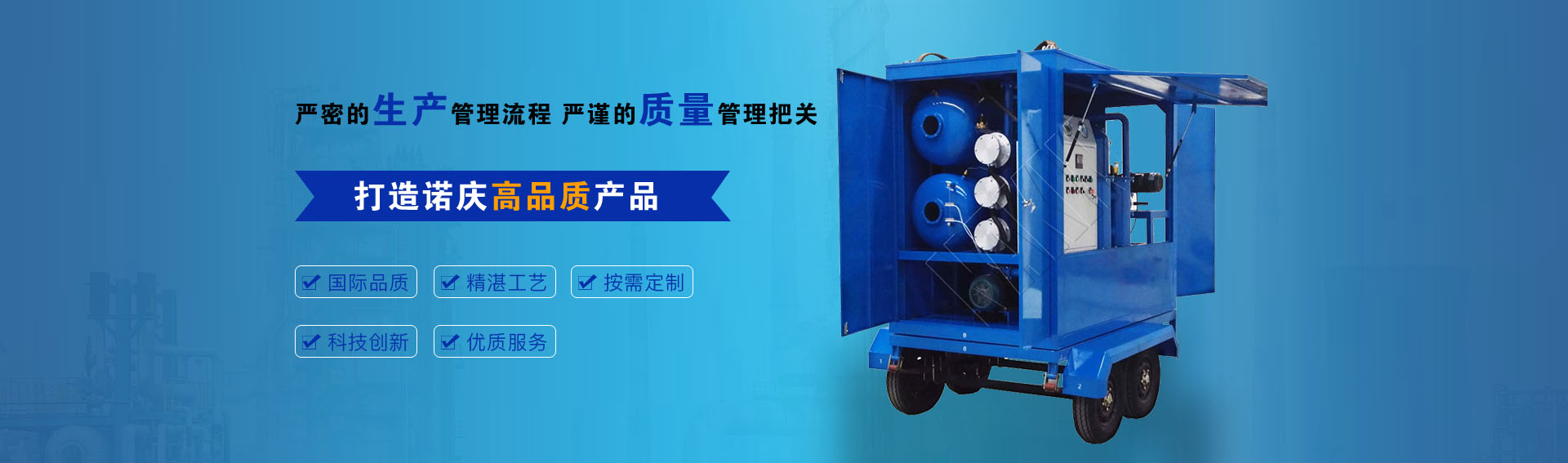 公司通過(guò)ISO9001-2015質(zhì)量管理體系認(rèn)證,CE歐盟認(rèn)證,諾慶公司所有濾油機(jī)配套產(chǎn)品均采用國(guó)內(nèi)外知名品牌,經(jīng)過(guò)多年的使用,具有質(zhì)量可靠,性能優(yōu)良。公司擁有完備的檢測(cè)儀器和檢測(cè)設(shè)備,所有產(chǎn)品出廠(chǎng)前經(jīng)過(guò)嚴(yán)格測(cè)試,保證每一臺(tái)產(chǎn)品合格出廠(chǎng)。